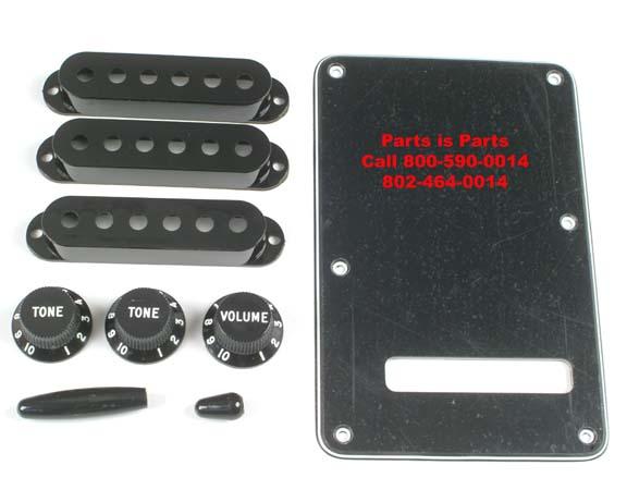 3 STRAT PICKUP COVERS, SWITCH TIP, KNOBS, TREM TIP, AND SPRING COVER